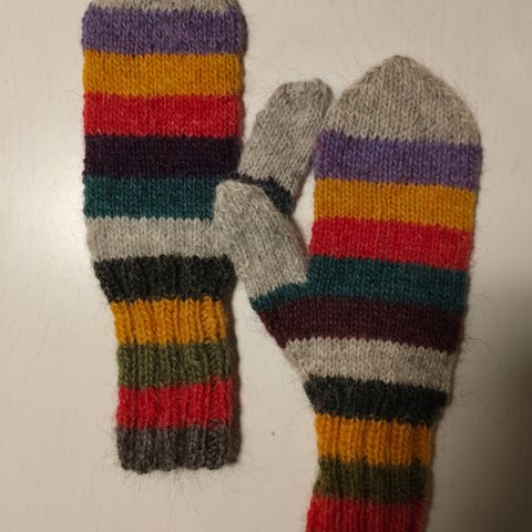 Itse neulotut lapaset islantilaisesta Lettlopi- villalangasta. Koko kapeahko naisten koko (leveys noin 8 cm)