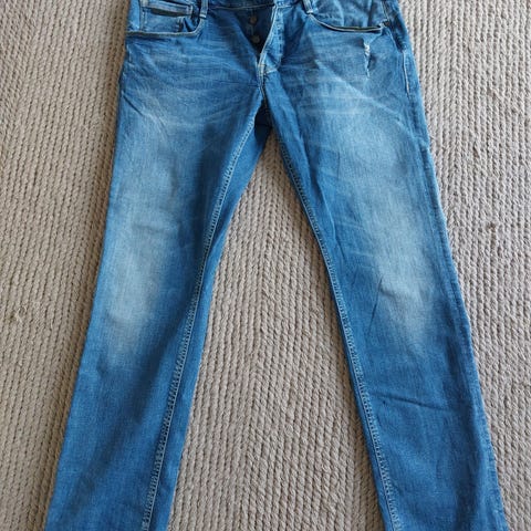 GUESS Angels Skinny -farkut miehille, koko M, vyötärönympärys W34. Väri harmaa, materiaali denim. Farkuissa on kulutuksia ja reikiä, jotka kuuluvat malliin.