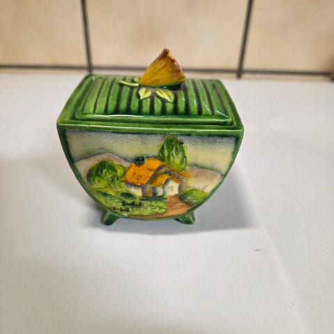 Koristeellinen munamuotoinen posliinirasia sininen ja keltainen