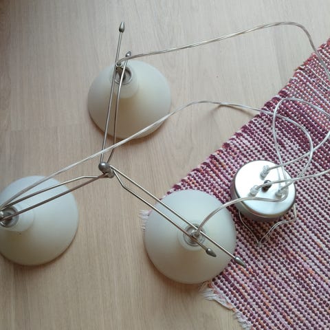 Vain vähän aikaa käytössä ollut kattovalaisin jossa 3 käännettävää spottia. Mattamusta pinta, spottien sisäpinta kultainen. Polttimot sisältyy. Tällä hetkellä keltaisella valolla olevat melko himmeät polttimot eli lamppu luo pehmeän valaistuksen. Vaihtamalla polttimot saa halutessaan kirkkaamman valaistuksen. E14 kanta. Ostettu prismasta, heat merkkinen. Hinta 30 €/tarjoa.