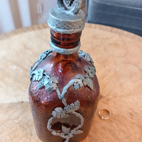 Lasinen koristepullo, muotoiltu koiran hahmoksi. Pullossa on korkki ja se on kirkasta lasia. Pullo seisoo neljällä jalalla ja siinä on kaareva kahva. Soveltuu koriste-esineeksi tai pieneen säilytykseen.