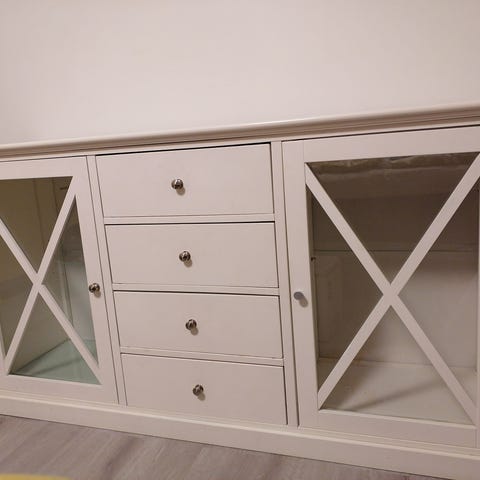 Myydään senkki ja peili. Senkin leveys 153 cm, syvyys 36 cm, korkeus 86 cm. Ylälaatikossa salalokerot (näkyy yhdessä kuvassa). Pöydän pinnassa jälkiä. Peilin koko 117 cm x 59 cm.