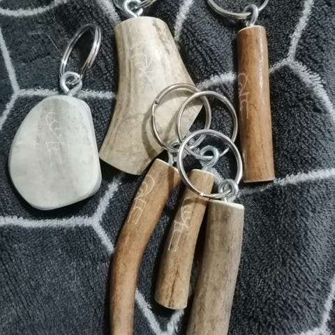 Kaikissa kaiverrettu poron kuva ja metallinen avainrengas.