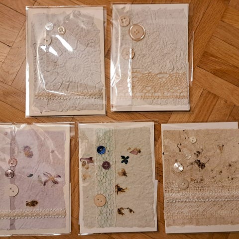 Itsetehtyjä 2-osaisia onnittelukortteja. Onnittelukortti sisältä tekstitön, mukaan tulee kirjekuori. Hinta 2,50/kpl.