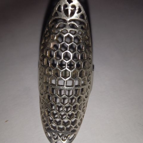 Sormus on näyttävä koristelun ja kokonsa puolesta.