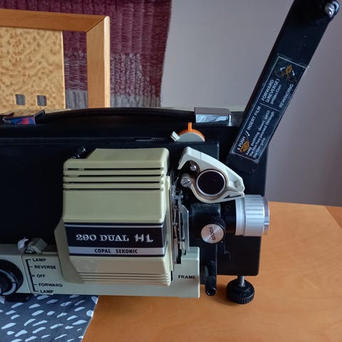 Eumig Wien Type P8 filmiprojektori, valmistettu metallista, väri valkoinen. Laite on tarkoitettu 8 mm filmien näyttämiseen. Varustettu manuaalisella kelan kääntökahvalla ja sähköllä toimivalla moottorilla. Mukana myös filmin leikkauslaite. Testattu tällä viikolla ja laite toimii