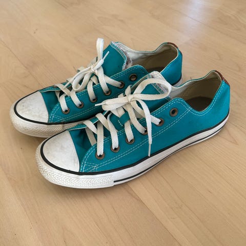 Kuvanmukaiset vaaleansiniset ( turkoosit) varrelliset Conversen tennarit. Kenkiä on pidetty vähän, joten kunto ulko- ja sisäpuolelta erittäin hyvä. Koko 41.