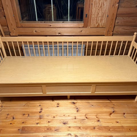 Puinen tyylikäs vuodesohva. Vähän käytetty ja siistikuntoinen. Alla vuodevaatteiden tilava säilytyslaatikko. Sohvan leveys hieman alle 2 m.