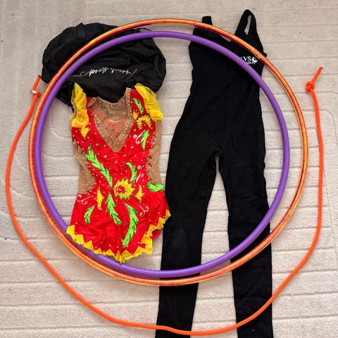 Lasten voimistelupuku koko 146, valmistettu monivärisestä sametista ja verkkomateriaalista. Puvussa on pitkät hihat, koristeellisia yksityiskohtia ja strassikoristeita. Sopii voimistelu ja tanssi esityksiin.