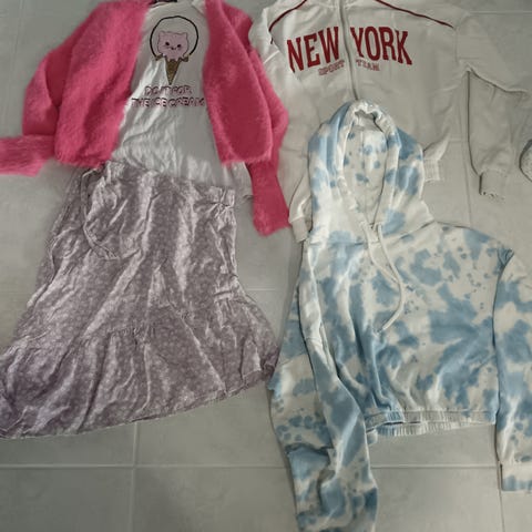 Adidas, Champion, Vila, Guppy, Kappahl, H&M merkkisiä vaatteita. T-paitoja, neuleita ja huppareita. 140-158 kokosia vaatteita.
