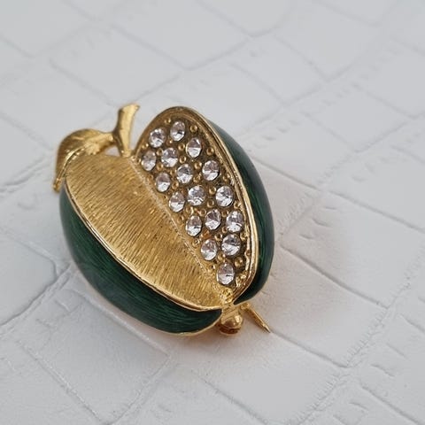 Kaksi rintaneulaa "Omena". Muovia. Halkaisija noin 3 cm.