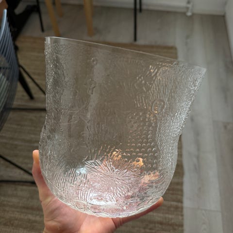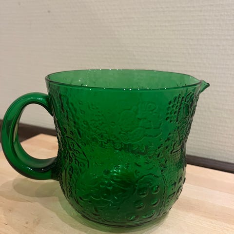 Vihreä malja, muutoin hyväkuntoinen mutta pieni särö, ei juuri näy. Halkaisija 12,5cm, korkeus 13cm, 1 litra