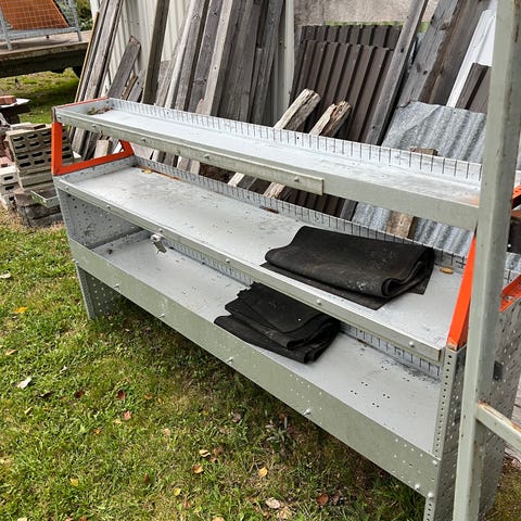 Myydään pakettiauton hylly + kaasupulloteline. Pituus 105, leveys 30 ja korkeus 101.