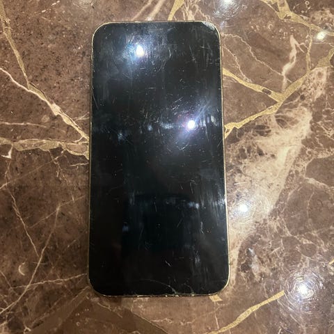 Apple iPhone 12 Pro älypuhelin, jossa 128 GB tallennustilaa ja hopeanvärinen takakuori. Laite sisältää useita kameroita takana. Takakuoressa ja näytössä on havaittavissa halkeamia ja naarmuja. Akun kunto: huolto.