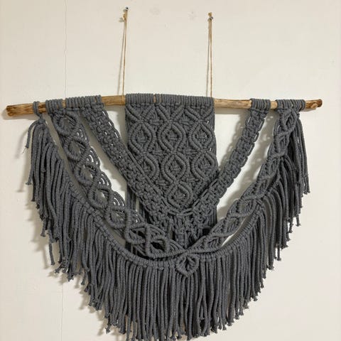 Myydään kuvan makrametyö. Leveys n. 85 cm ja korkeus kepin yläreunasta alimpaan sulkaan n. 35 cm, naulasta alimpaan sulkaan vajaa 80 cm. Nauha on lyhennettävissä, minkä kautta kokonaiskorkeus on säädettävissä. Sulkien värit vaaleanpunainen, beige ja harmaa.