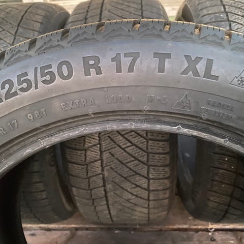 Kaikki renkaat 225/50r17 kokoiset. Kaikissa pintaa 4-5mm, mutta yksi rengas reunasta kulahtaneempi.