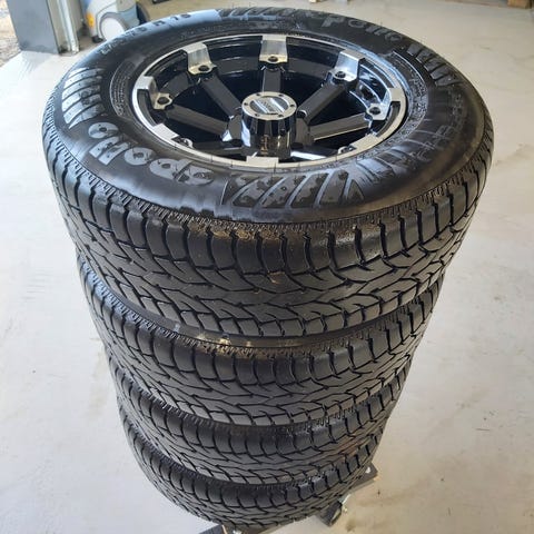 Takana Kitkat ja edessä kesärenkaat. Molemmissa hyvin pintaa. Yhdessä vanteessa vekki, josta myös kuva. Mukavat ajaa.