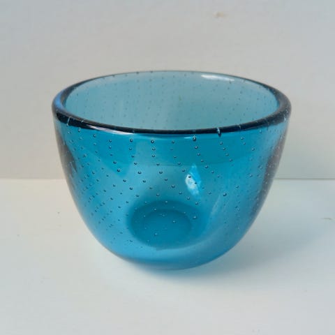 Ruiskukan sininen uniikki Paunilan lasipuhaltamon vaasi Riihimäeltä. Vintage. Kork. 16 cm.