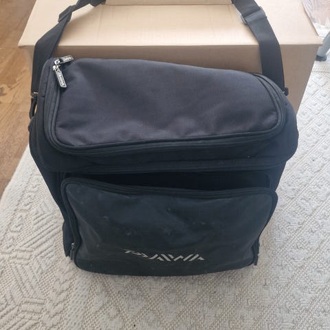 Kuvan tilava kalastustarvikelaukku käytetty ja käyttökelpoinen joskin kannen sisäpuolelta vuorin sauma irronnut yhdestä reunasta muttei estä käyttöä