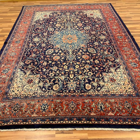 Tämä on erittäin kaunis ja hyvin vanha käsinsolmittu matto, persialainen saroug. Se on melko vanha, noin 60 tai 70 vuotta vanha. Hapsut ovat puuvillaa ja kudos villaa, mikä tekee siitä kauniin ja todella viehättävän maton. Tämä matto on kooltaan suuri, joten se sopii erinomaisesti olohuoneisiin, makuuhuoneisiin tai, jos keittiö on suuri, suuriin keittiöihin. Ikänsä vuoksi matto on myös puoliantiikkinen. Väriaineet ovat alkuperäisiä kasvivärejä, tai matonvalmistajien ammattikielessä sitä kutsutaan krapaksi. Yleensä hyväkuntoisessa matossa voi olla pieniä käytön jälkiä iästä johtuen, mutta sen käyttöä ei ole syytä estää, ja se on käyttövalmis.