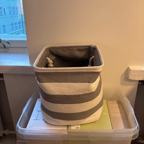 Punottu kori, jossa on irrotettava valkoinen kangasvuori. Kori on valmistettu luonnonmateriaalista ja soveltuu säilytykseen tai koristekäyttöön.