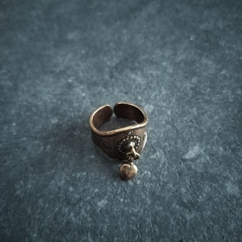 Myydään Kalevalan Sydän-sormus, pronssinen. Säädettävä koko, tällä hetkellä sopii noin 19 mm sormuskokoon. Käytetty, eli pintakäsittelyaine on kulunut pois, mutta uudelleenkäsittelyllä sormus vastaa kunnoltaan uutta.