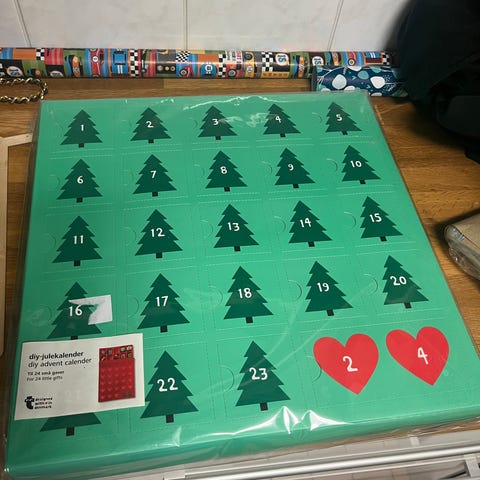 Suuri joulukalenteri, jossa tasku joka päivälle. Korkeus noin 150cm. Nouto Espoosta tai postitus 7€.