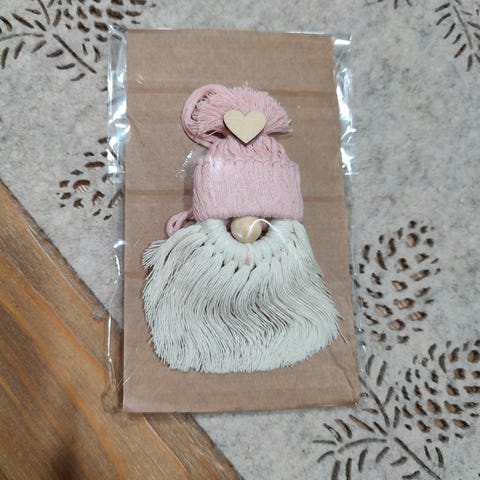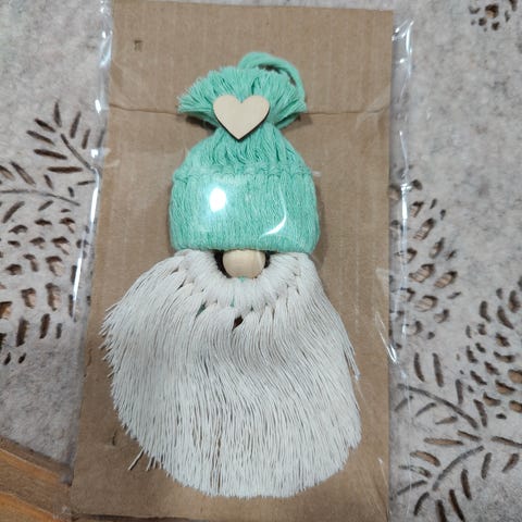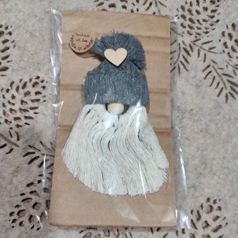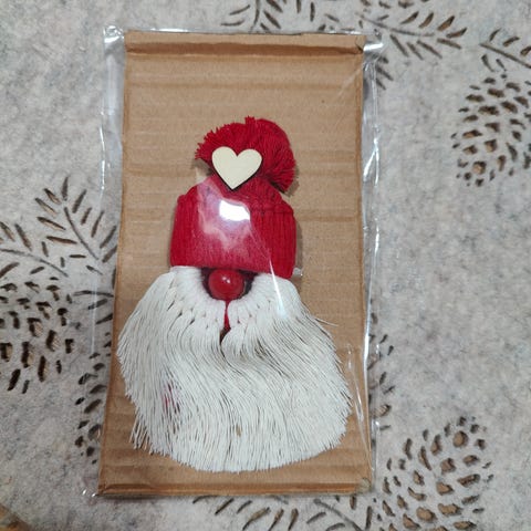 Makrameetonttu pakattuna. Löytyy ripustusnaru.