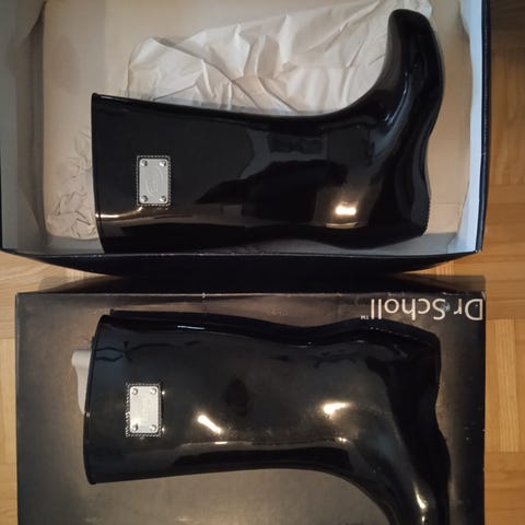 Käyttämättömät naisten Pertti Palmroth- lakerisaappaat omassa laatikossaan. Varren pituus ja päkiän leveys näkyy kuvissa.