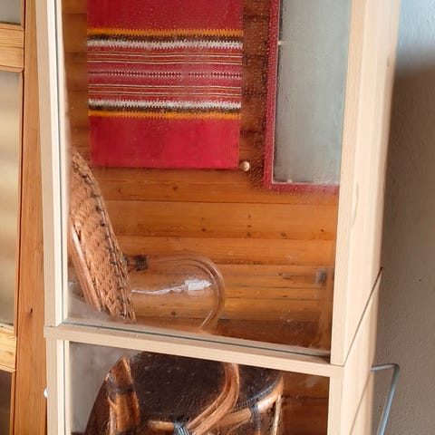 Liukuovilla oleva tukeva kaappi johon olemassa kaksi jalkaa jotka saa mukaan. Liukuovien mekanismissa pientä häikkää...