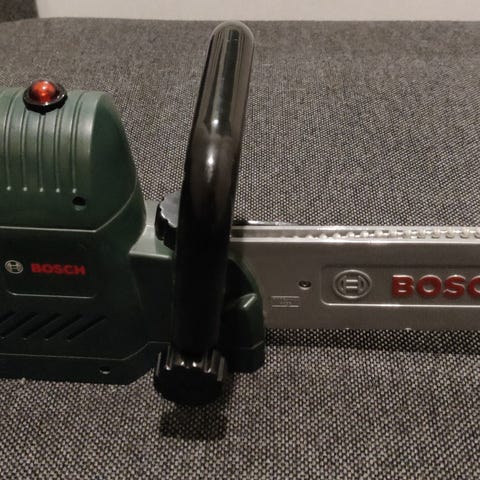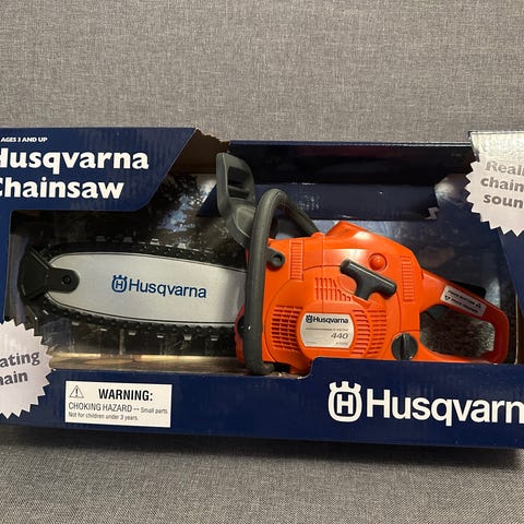 Hyvässä kunnossa oleva leikkimoottorisaha ja varusteet, ainoastaan laseissa on naarmuja.