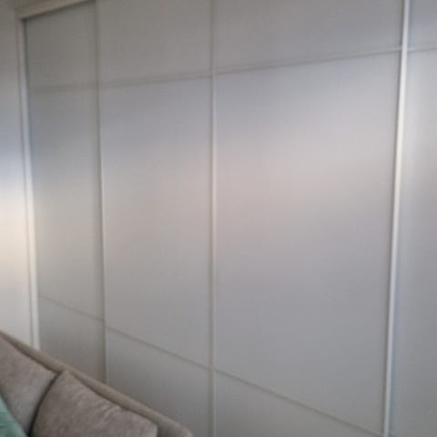 Kotimaiset Liukuovi Centerin valmistamat alumiinikehyksiset liukuovet mittojen mukaan, Kaapiston sisäkorkeus 225cm ja sisäleveys 137cm. Oven yläkisko vaatii syvyyttä 8,5cm. Ovien materiaali on valkoinen kirkas lasi ja kehys harmaa alumiini.