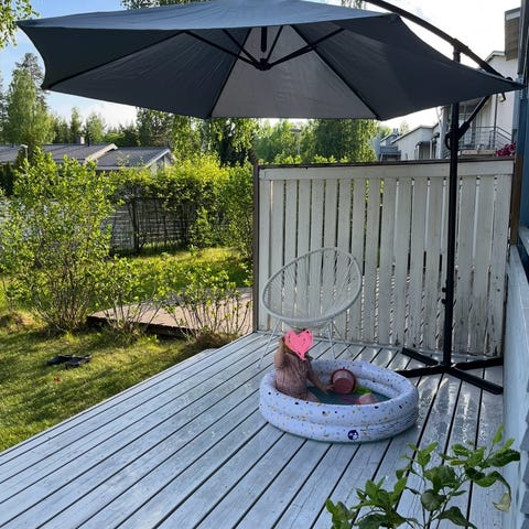 4m halkaisijalla oleva aurinkovarjo mallia sandels, kangas osittain rikki mutta runko hyvässä kunnossa,kangas korjattavissa/vaihdettavissa.