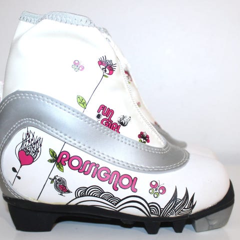 Pari talven ajan hellästi hiihdetyt Rossignolin karvapohjasukset ja Alpinan 33-kokoa olevat monot. ”Speed Rskin”. Rossignolin siteet. Huom. sauvoja ei tässä paketissa.