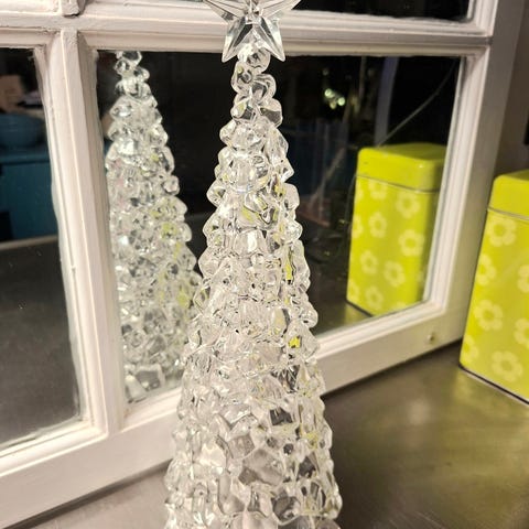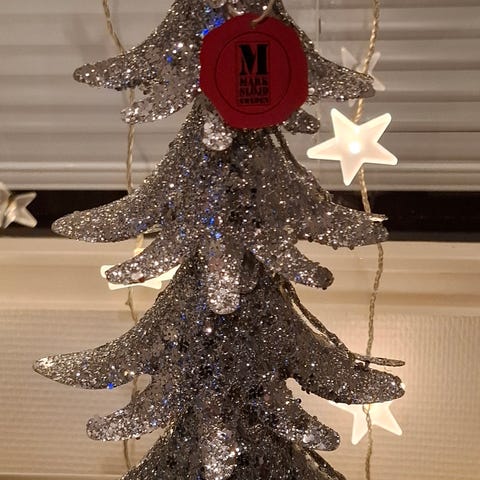 Kuvan mukainen kuusi. Kaunis valkoinen. Koristeena pieniä helmiä ja hopeahohtoa.