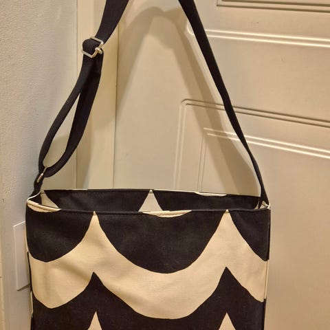 Uusi ja käyttämätön laukku jossa Marimekon lappu paikallaan. Mahdollisesti joskus kumminkin on ollut jotain laukussa säilössä josta on jäänyt hyvin pieni tummaviiva laukun sisäpuolelle jonka takia laitoin kuntoluokaksi kuin uusi.