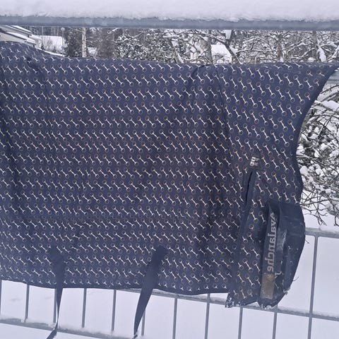 Tummansiniruutuinen kevyttoppaloimi, kaula-aukkoon lisätty toppapehmusteet ja selkäosaa jatkettu (pituus 148cm), häntälenkki ja mahavyöt. Ei juuri pesty, mutta suht siisti, sisäpinta liukas. Hintaan lisätään lähetyskulut.
