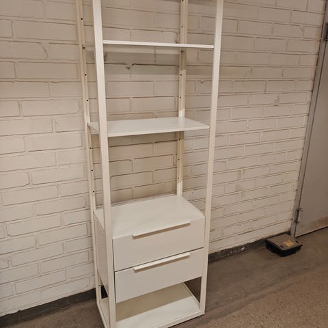 Harmaa Muuton folded hylly koukuilla. Siiti, mutta pari mustaa viivaa hyllyssä, näkyy kuvissa.