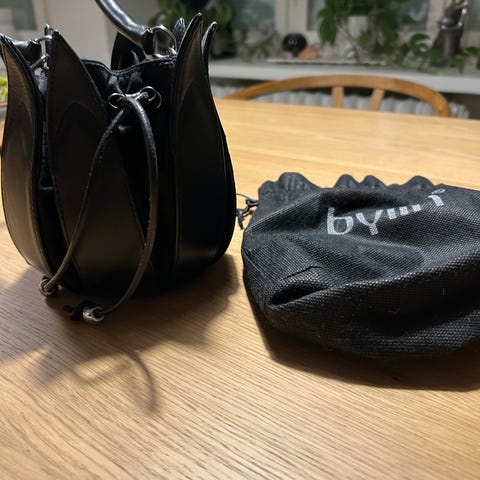 Upea iltalaukku, joka on valmistettu turkulaisessa nahka-ateljeessa. Ulkomitat 14x30 cm, paksuus tyhjänä 2 cm. Sisällä isompi välikankaalla jaettu tila, ja läpän alla vetoketjullinen tasku. Laukku suljetaan painonapilla.