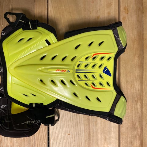 Junnulle uudet ajovarusteet esim motocrossiin ja mönkijällä ajoon. Koko S/M, sopii +145cm pitkälle lapselle (viimeisissä kuvissa 145cm pitkällä hoikalla, josta näkee paremmin kokoa). Ajopanssarissa hyvät säädöt vyötäröllä (koko S/M), samoin polvisuojissa (koko XS).