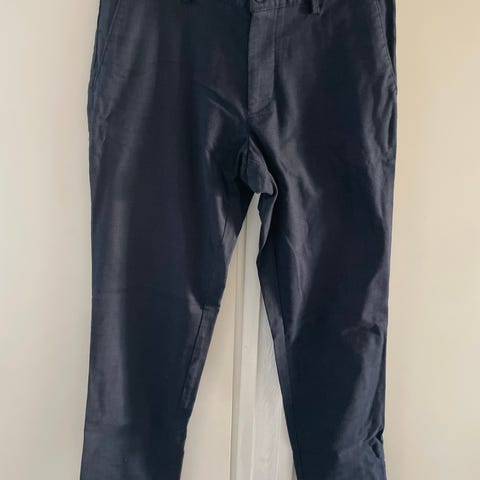 Myytävänä Kanzler tummansiniset pukuhousut miehelle, pituus noin 103 cm. 73% polyesteri, 25% viskoosi, 2% lycra.