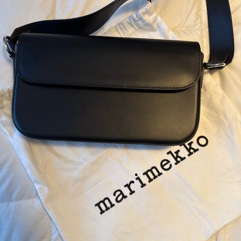 Marimekko musta nahkainen clutch. Sisäpuolella on mustavalkoinen raidallinen vuori. Laukussa on magneettikiinnitys. Leveys 22 cm, korkeus 14 cm ja paksuus n.1,5 cm tyhjänä.