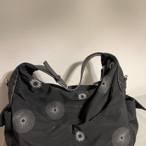 Desigual Kangas Naiset laukku, jossa on kukkakuviointi ja mustat teko nahkaiset kahvat jotka vaatii korjausta sekä olkahihna. Laukussa on vetoketjullinen päällinen ja useita taskuja. Värit pääasiassa sininen, pinkki ja musta. Siisti sisältä.