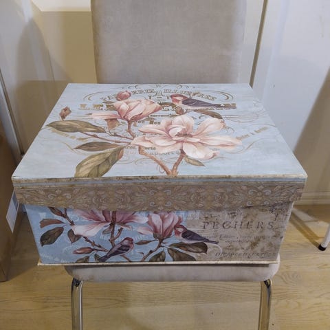 Sisustusliikkeestä ostettu kaunis veistokoristeltu säilytyslaatikko. Korkeus 27 cm. leveys 27 cm ja syvyys 16,5 cm. Etureunat kokonaan veistokoristeltu. Väri valkoinen ja kunto uutta vastaava. Käsitelty kuluneen näköiseksi maalaisromanttiseen sisustustyyliin kuuluvalla tavalla jo tehtaalla. Myynnissä Lohjalla, mutta kulkeutuu omien menojen mukaan Helsinkiin, Espoon Ikealle ja Espoon keskukseen ilman postikuluja.