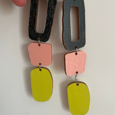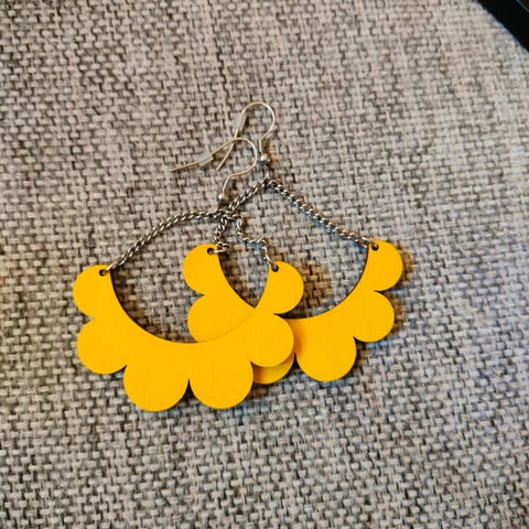 Myydään vähäisessä käytössä olleet Maanantaimallin korvakorut, koivuvaneria. Värinä musta, isompi koko.
