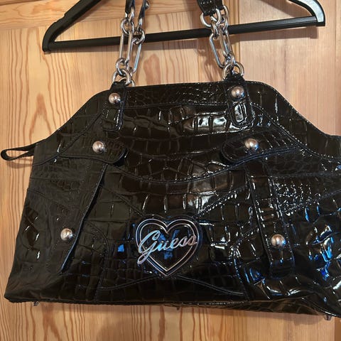 Guessin musta aito nahkainen olkalaukku. Kuittia ei ole, dustbag ja tuotelappu löytyy. Oikein on siisti kunto, jotain pientä kulumaa olkaimessa (kts viimeinen kuva). Voin ottaa lisäkuvia tarvittaessa.
