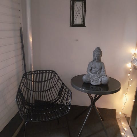 Ulkokalustesetti sisältää pyöreän pöydän, jossa musta metallirunko ja lasikansi, sekä kaksi mustaa metallirunkoista tuolia, joissa on punottu istuinosa. Sopii ulkokäyttöön, esimerkiksi terassille tai parvekkeelle.