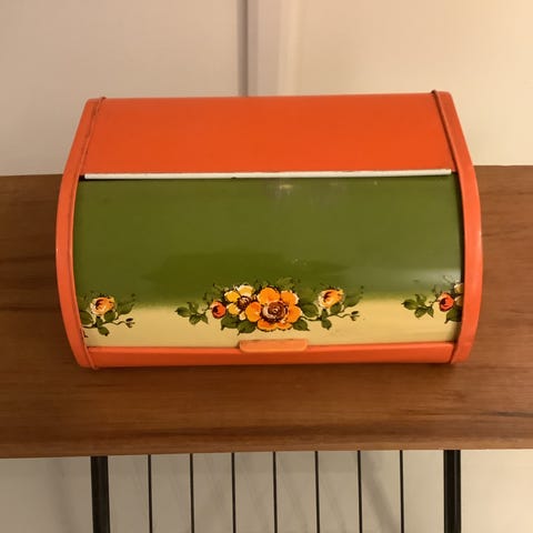 Retro peltinen, söötti leipälaatikko. Täysin ehjä. Leveys 40 cm, korkeus 28 cm ja syvyys 18 cm. Nouto Naantalista.