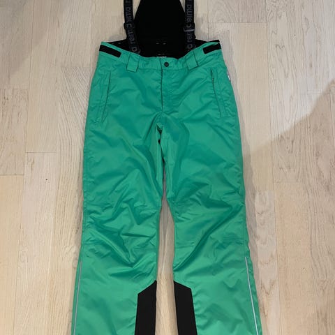 ReimaTec vedenpitävät lasten toppahousut koossa 158cm, väriltään tummansininen. Irrotettavat henkselit, lahkeessa lumilukko. Housuissa on säädettävä vyötärö ja heijastimet lahkeissa. Kaksi vetoketjutaskua. Polvissa jonkinverran kulumaa (huomioitu hinnassa), pepun kohdalla ei juurikaan.