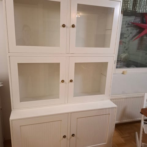 Kaksiosainen täysipuinen vitriinikaappi lukittavilla ovilla. Avaimet tallessa. Kaapin päällä jälkiä. Nopeat noudot etusijalla